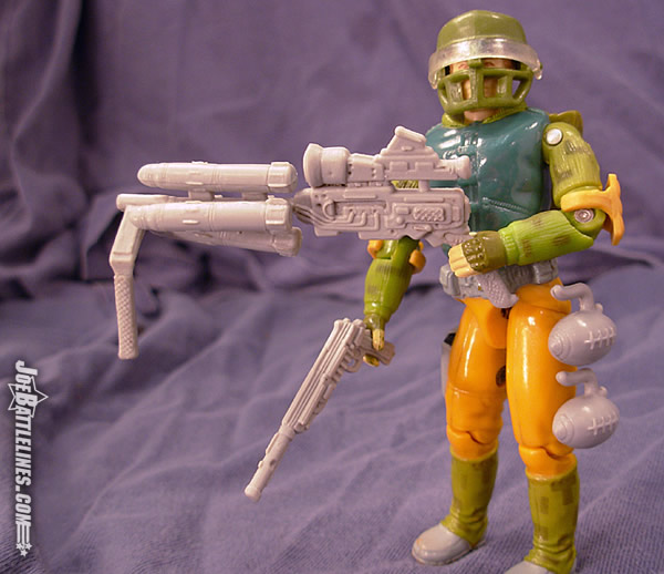 There is no connection between this extraordinary boring characters and the Broken Lizard movie or the Abba song, but either one might have helped. Just look at him and try not to imagine some tired Hasbro exec hastily throwing together a few recycled part from other Joes to make a new character for his boss so he can go home and drink. We hope it was worth it, Hasbro man. His only even slightly distinctive characteristic is his shiny armor, which only makes him look like an extra in a George Clinton video.
