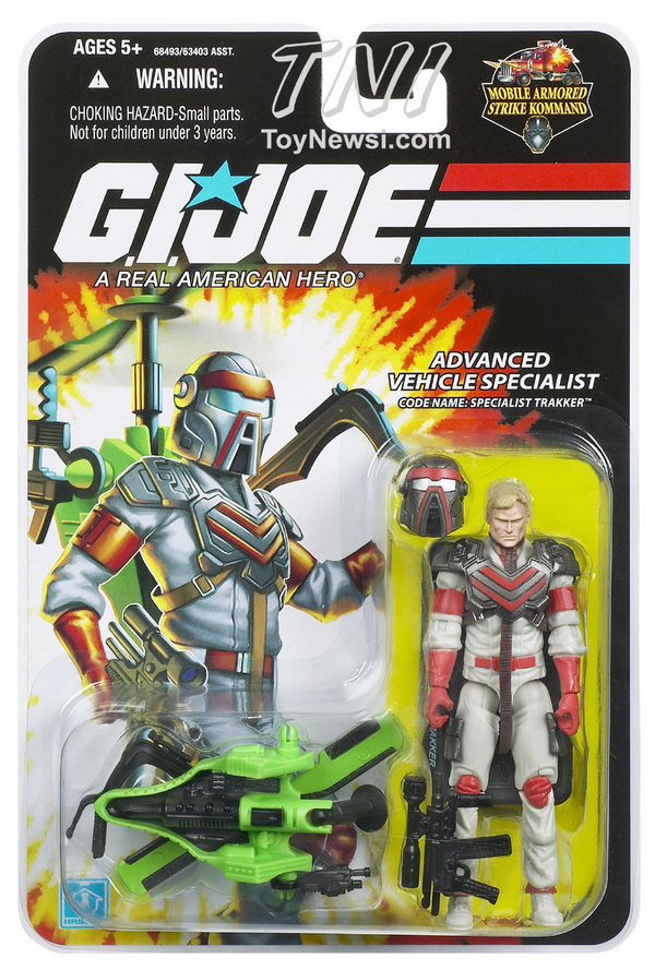 From 3-inch toy to 4-inch bad-ass action figure in the new 25th Anniversary G.I. Joe collector’s line. Now, I know we’ve known about ol’ Matt for a while, but I thought it was newsworthy to post his card (check out the little MASK logo on the upper right) and the best pic of the figures and his mask that I’ve seen available. In case you don’t recall, Matt is part of series 7, which includes Sgt. Airborne, a Cobra Eel, Flint in his Cobra soldier disguise (he looks pretty awesome), a dead sexy Scarlett in her pilot outfit, and “Swamp Squad” Zartan, who comes with not one but two masks?you can see great pics of all the figures and their cards over at ToyNewsI. Matt and crew should be hitting toy stores this month, so start “trakking” him down now! Ha ha! Oh, I hate myself.