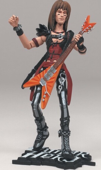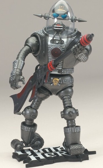 Oh, you didn’t think they were finished with only one Guitar Hero action figure series, did you? Of course not. McFarlane will release a new set in early 2009 of Judy Nails, Izzy Sparks, Slash (not pictured because he looks like Slash), Lou (last name possibly Siffer) and Metalhead, the robot I had not seen before but instantly love (I’m a sucker for robots wearing German military caps, what can I say). As you can see from the pics, these 6-ish figures continue to have the miracle of articulation, the amazing process recently discovered by McFarlane Toys which allows figures to be posed in different ways. (Via ToyNewsI)