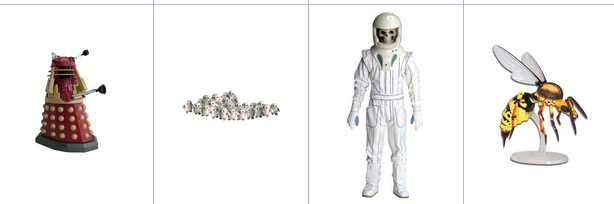 Keep in mind that of the few things I know about Doctor Who–oh, excuse me, “The Doctor”–is that the TARDIS is much bigger on the inside than the out. Which is good, becuase Underground Toys next sets of Who figures are not insignificant. Above is Series 4, which apparently comes with a Vespiform build-a-figure; the figures from left-to-right starting with Row 1 include: Davros, Donna Noble, Hath Peck, Natural Ood; Row 2 includes Ood Sigma, Pyrovile Priestess, Professor River Song, Sontaran Trooper (apparently Sontaran General Staal is also part of the wave, and not pictured); and Row 3 has a Supreme Dalek, a pile of 25 Aidpose Adipose, the awesome Vashta Nerada Suit Creature (I love undead astronauts, what can I say) and the Vespiform itself.
