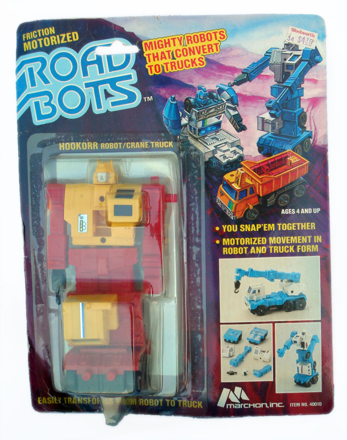 Marchon’s Road Bots were a bit of a cheat. While being motorized was a nice feature, you had to take the robots totally apart to transform them into construction vehicles. Each toy was also sold in many different color schemes. But Marchon was awesome for either their total audacity or utter cluelessness in naming one of the figures Hookorr, as seen above. Even better, Hookorr was “friction motorized.” Did these robots have a side profession they wanted to tell us about? Talk about more than meets the eye!