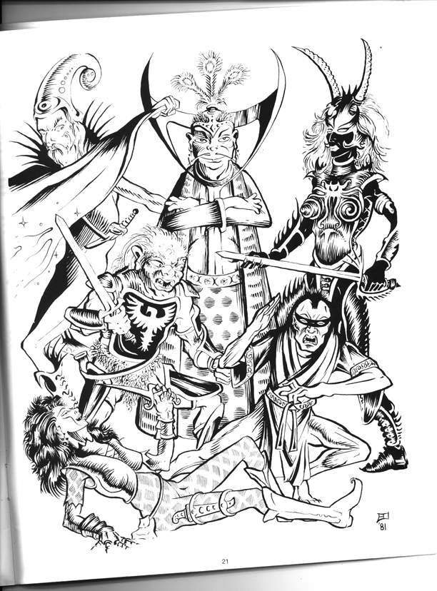 The Slavers series (A1-4) is perhaps best remembered for the stuff that happens to the characters — mainly being railroaded into losing all their stuff and getting tossed naked into a dungeon — as they seek to end the local slave trade. But the bad guys themselves are pretty nifty in and of themselves, and if run right, pretty damn dangerous. If you can ignore the obvious Asian stereotype (which is easy now… thanks, Star Wars prequels!) High Priest Stalman Klim is pretty badass. Half-orc fighter-assassin (and hyphen master) Theg Narlot has some nasty poison (but really shouldn’t stand like that while wearing a loincloth). Edralve the drow fighter-cleric has sort of a Madonna boob-cone thing going on there, and Lamonsten the Illusionist doesn’t really look fully drawn… but such is his power of illusion! Slippery Ketta is laying down for some reason, but seems to be enjoying the view that Theg is providing. And Brother Kerin the monk brings us full circle back to “yellow peril.” And the best thing? They’re all standing there at the end of the module, trapped on a pier, surrounded by man-eating lacedons in the water. They exist at this point only to be killed and looted. Ah, original D&D!