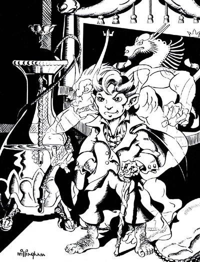 White Plume Mountain has two end-bosses, really. Quesnef is the one you actually get to fight — he’s the Ogre Mage who looks like the Halfling — and the beauty part is that in the grand tradition of static set-pieces, he’s just there to slay. No motivation, no nothing–he’s just been magically forced to stay in that room and guard the treasure until you show up, kick his illusionary ass, and abscond with the Stormbringer-knockoff Blackrazor. Sweet! Keraptis, on the other hand, is apparently far too powerful to confront — he never appears (though at the end, he taunts you and sends a couple of efreet to take you captive), which makes him one of two villains from White Plume Mountain — him, and the undead dragon Dragotha, pictured menacingly in Erol Otus’ map at the beginning — that players wouldn’t get to battle until much later in the ongoing expansion of D&D.
