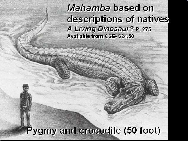 ?Mahamba is a 50-foot crocodile possibly descended from prehistoric serpentine marine reptiles called mosasaurs. It reportedly lurks in swamps in the Democratic Republic of the Congo and eats canoes in one bite. Are you listening, Syfy Channel Original Movies Division? The remote Congo has many legendary cryptids, and that could be a whole story in itself.