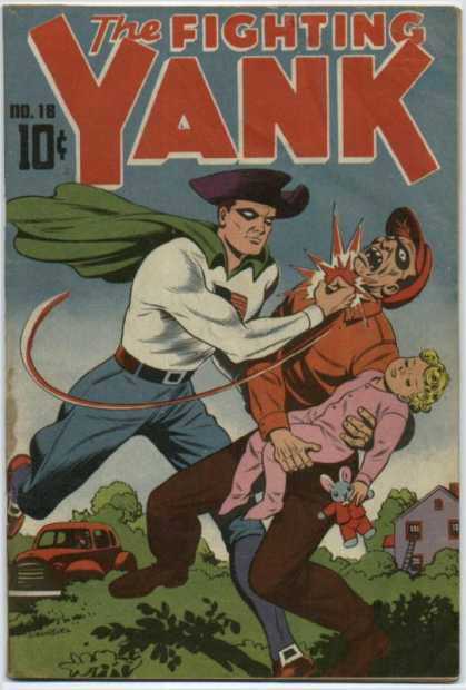 ?Golden Age means public domain! Fighting Yank originally appeared in 1941, which means that any writer who wants to can use him in their books. He’s appeared in Alan Moore’s Tom Strong comics and the current Project Superheroes. The best part about Fighting Yank? He’s haunted by the Spirit of America, a ghost from the American Revolution who gets on him when he’s not being useful enough. Basically, he’s haunted by the spirit of my dad.