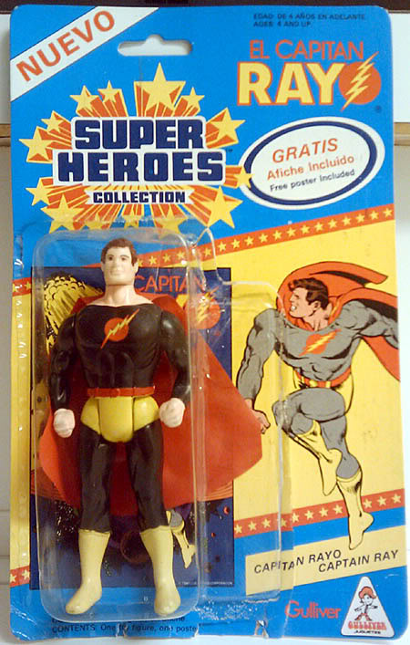One of the companies decided to spice up the line a bit by adding their own character: El Capitan Rayo. He’s a repainted Superman with the Flash’s chest symbol. According to the bio on his packaging, he can fly, blast lightning, and his alter ego is one Francisco D’ardoine. His enemies include Captain Squad, Tigerwoman, and LX230. What’s perhaps most shocking about all this is the fact that El Capitan Rayo and his enemies have yet to be brought into the DC Universe proper as part of some bizarre storyline by Grant Morrison