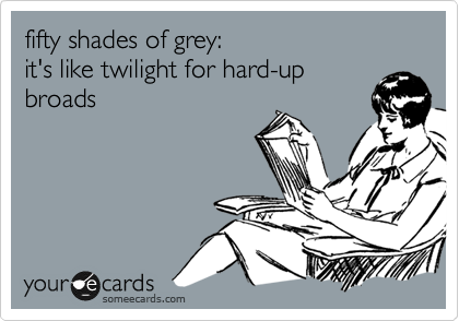 I’ve not really mentioned Fifty Shades of Grey, the best-selling BDSM “mommy porn” trilogy, but it makes me so, so sad. This is because it first came to life as a fucking Twilight fan fic, when the author changed the name of Bella Swan to the equally stupid Anastasia Steele, turned Sparkles the vampire into some kind of young business owner, wrote about them fucking S&M style a lot and basically sold a jillion copies. The more I think about this, the more suicide looks less like a desperate escape from reality and more like a rational response to the world we live in.