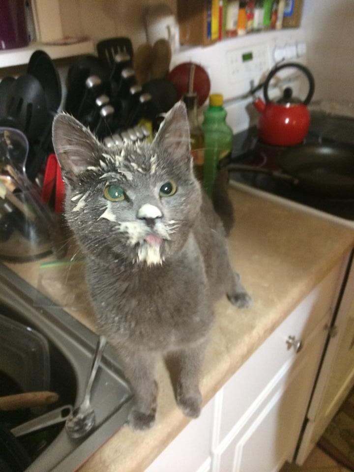Whenever we make dinner, we always have to lock the little guy up in the office or bathroom. If we don’t, he’ll jump up on the counter constantly and eat ANYTHING he can get his paws on. You’ll put him down and he’ll be back up on the counter a second later. He’s relentless. If we don’t put bread away the moment we get home from the grocery store, he’ll rip into the bag. Same goes for any pastries in plastic containers. My sister got me a cookie cake for my birthday, which I mistakenly left on the table. Less than 5 minutes later, we heard a crash from the dining room. I’m guessing you know what that was.