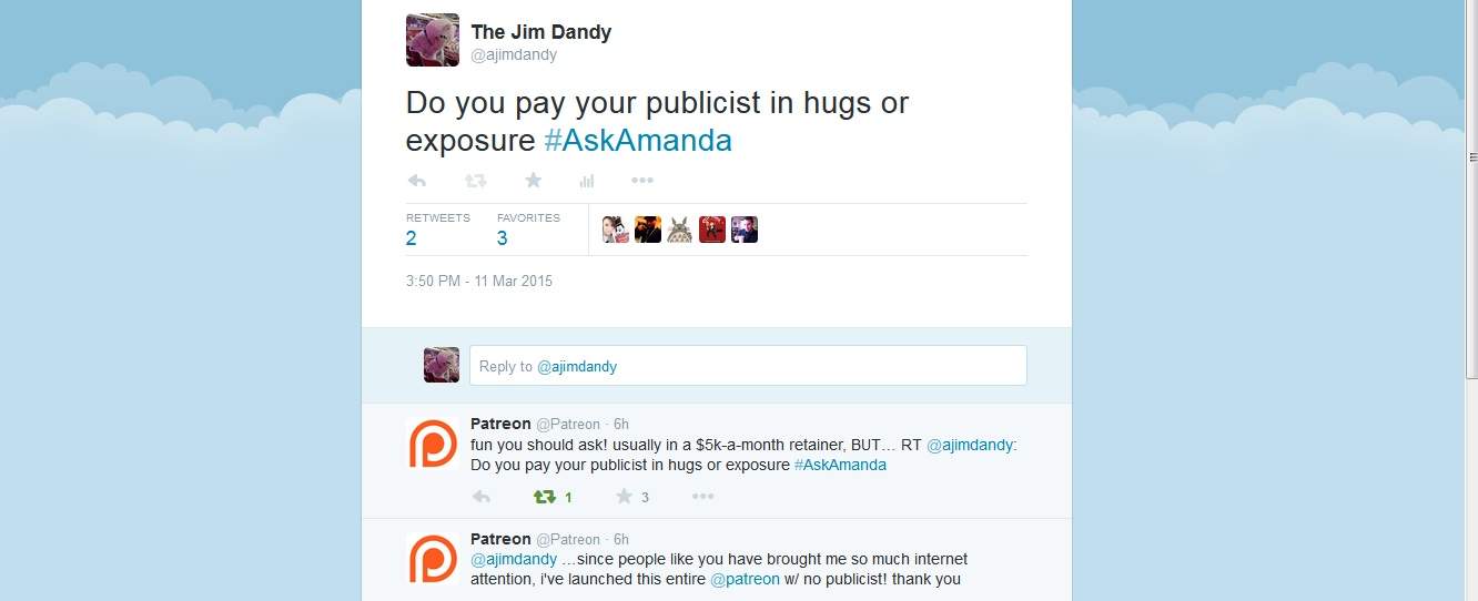 Last month, Amanda Palmer, the former lead singer of the Dresden Dolls (and now professional moocher) did a Twitter takeover of Patreon’s account, where she addressed questions about her position on the bleeding edge of useless sloth with a glib throwaway line about how much she doesn’t have to pay her publicist anymore. For what I assume was her first “thing,” she posted a new song online, hammered the “MONEY PLEASE” button and was rewarded with $28 grand. For a song she already recorded. Without, I assume, crowdfunding support for studio time or musicians. And she felt cool with charging her supporters, on average, $7.50 each to listen to it. We’re really pushing the boundaries of goods and/or services, here.