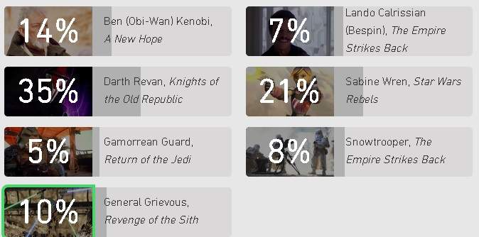 It’s interesting that while all seven had significant support in our survey, only Revan – who is easily winning, and whose strong resemblance to the new movie’s Kylo Ren must be noted – made it to our top tier. Mara Jade, who was easily our favorite, is nowhere to be seen.