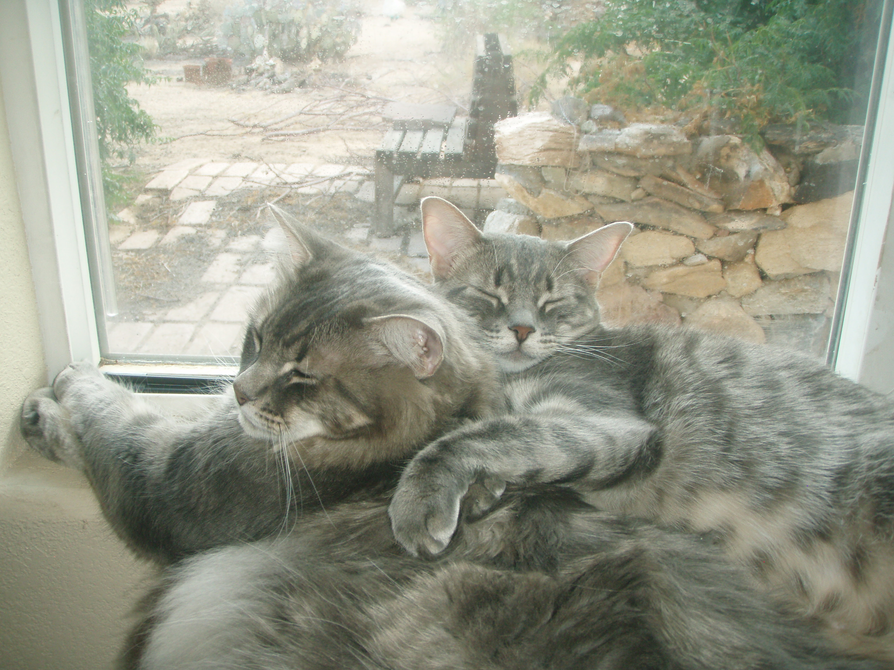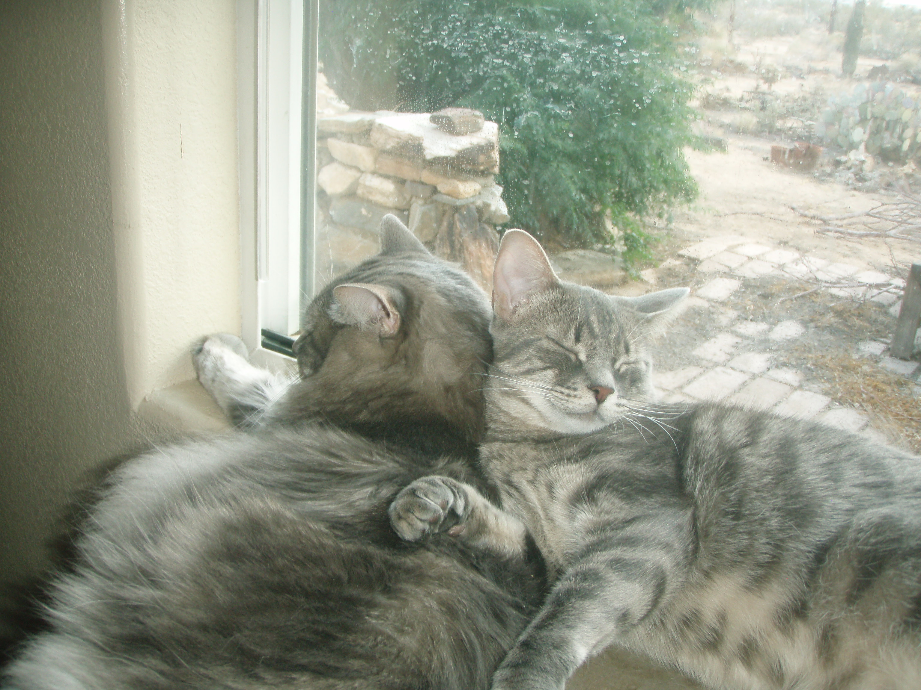 Thank you all this week for the great volume of questions. Keep them heading my way. This weeks kitty pics are of Frizzy and his sister Lovey being cute and cuddling at the window. She had her arm around him and was licking the back of his head – it was so cute.