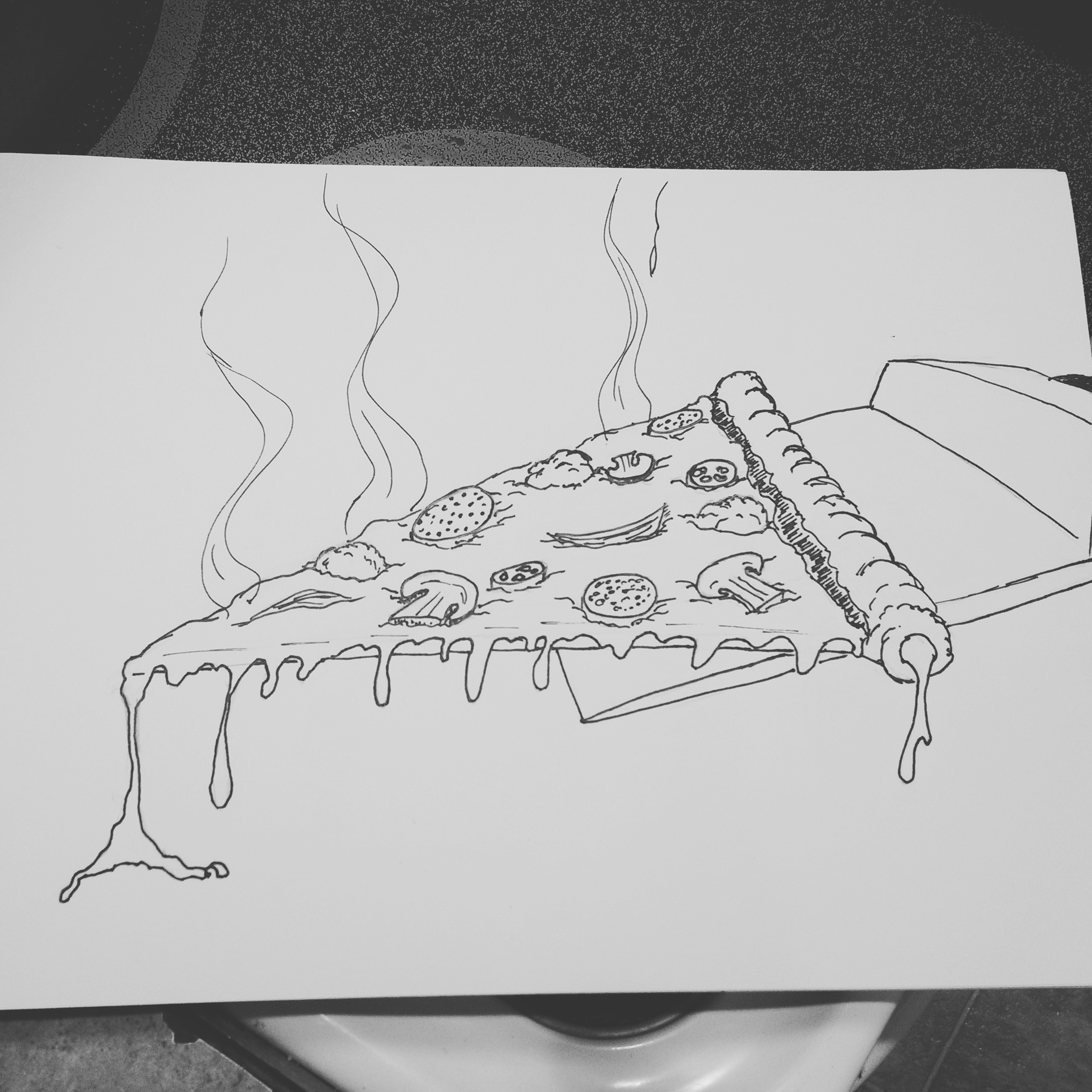 Eschewing my normal heavy-handed shading for pencil linework and careful inking, I channeled my hunger into the first thing that came to mind. My pen quickly formed a hearty slice of stuffed crust ‘za, dripping with gooey mozzarella and topped with a liberal heaping of everything. Except pineapple. Still, that’s a pretty good-looking slice! Overall, I’m going to consider my Inktober experiment a success.