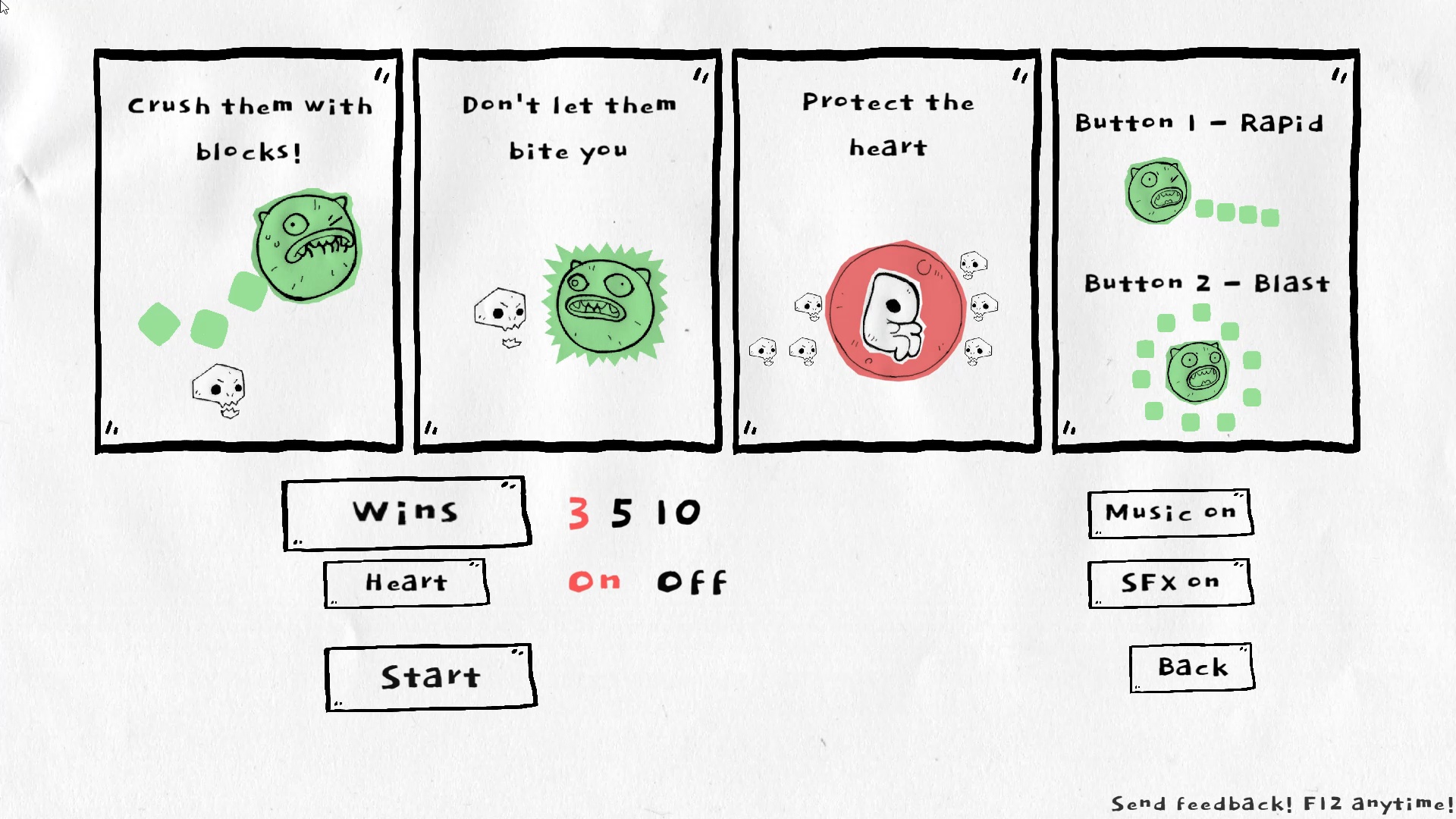 Once the heart dies by getting bitten by too many skulls, the round ends, and the player with the most wins after 3, 5, or 10 rounds takes home the tournament trophy. Alternatively, if all other players exhaust their lives, the last player standing gets a 30 second timer. With enough skill, the last player can to try to take the high score and snatch victory for the current round.