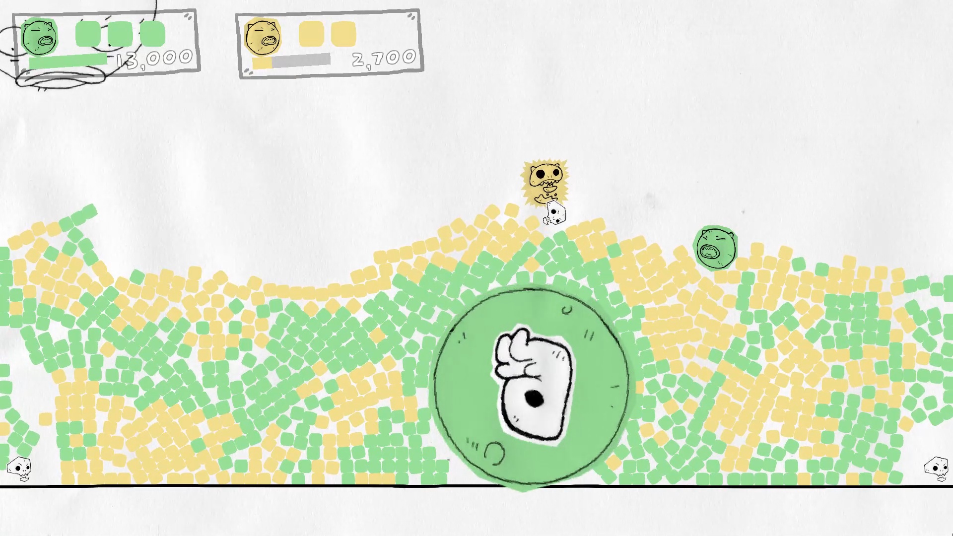 Block Pooper 9 dumps players into a singular arena with one of two slightly different game modes. The cat heads are controlled sort of like a rocket ship, and are directed by spraying square waste in the opposite direction you wish to propel. Button two on the controller blasts a radial poop explosion, or can be directed sort of like a shotgun (shart-gun?) blast to send forth a directional cascade of butt blocks that buries opponents.